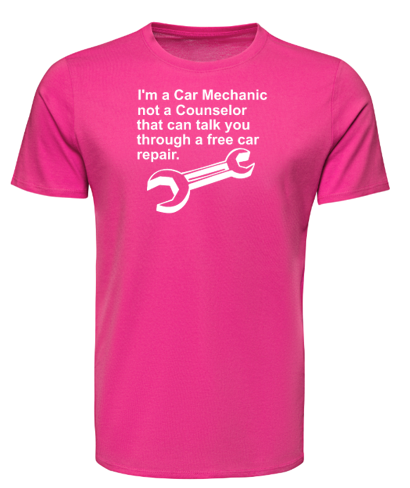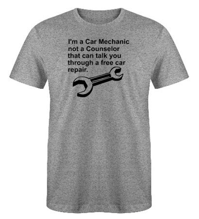 The I'm a Car Mechanic Not a Counselor t-shirt is a humorous shirt that expresses a Mechanic's love of his craft. This t-shirt is a great shirt to wear everyday and it would make a great gift for your family, friends, and your dependable Mechanic.